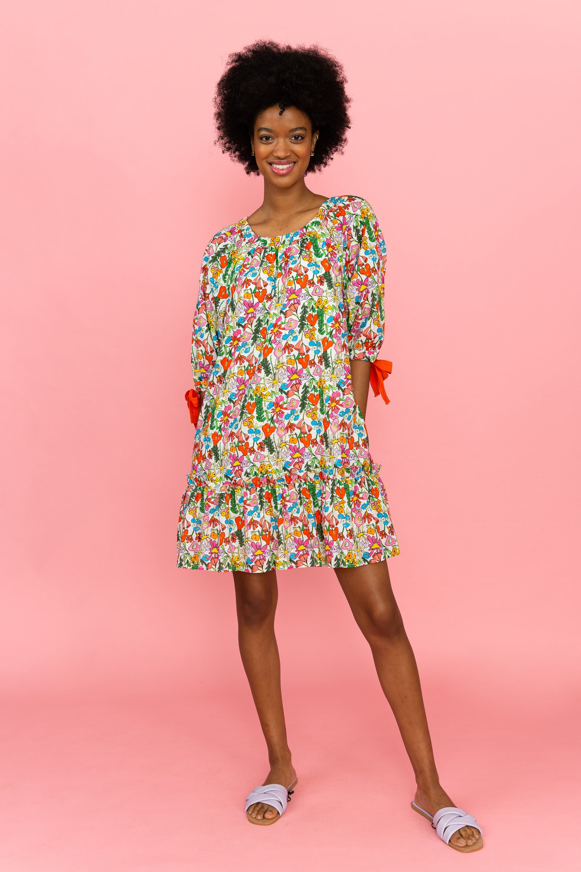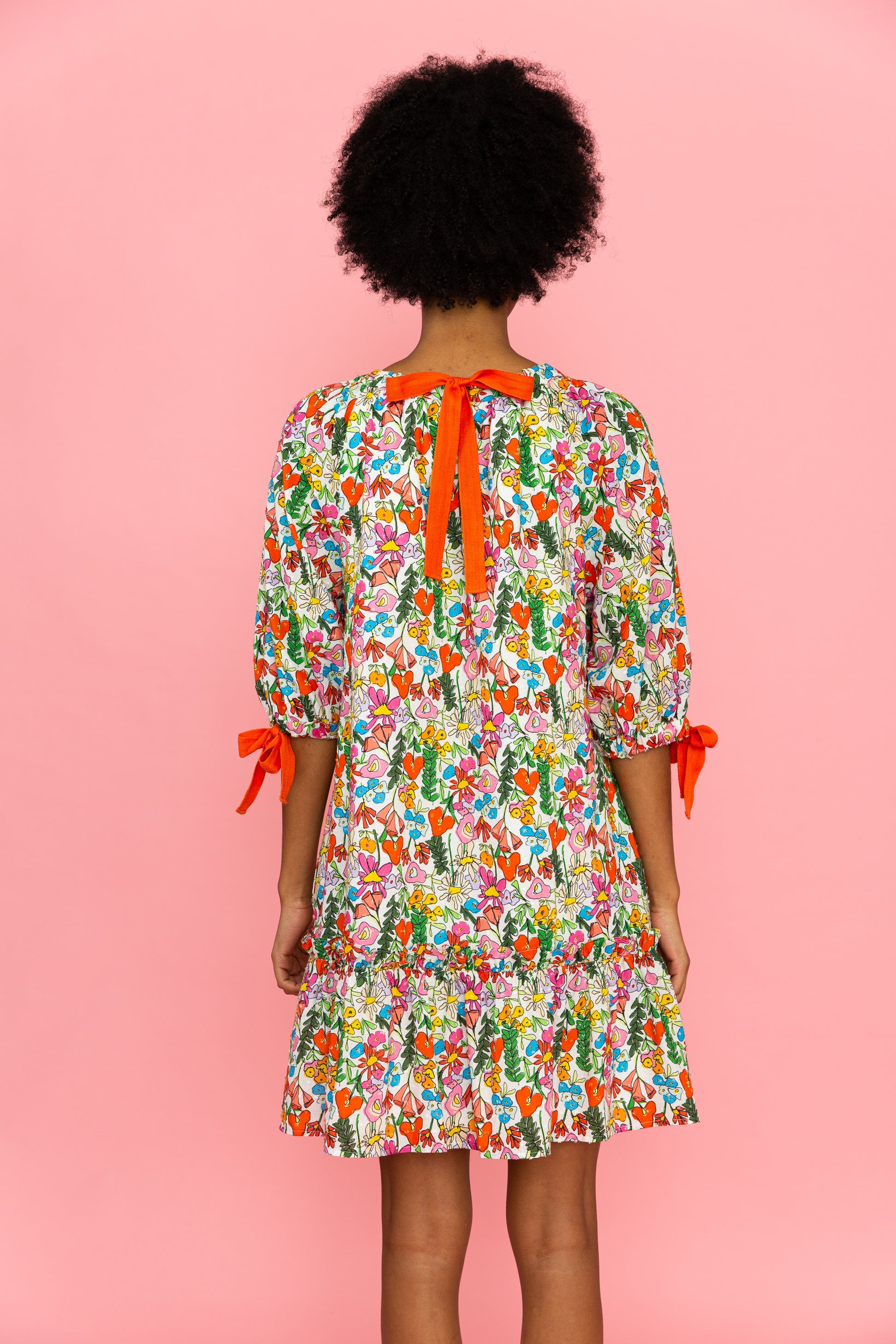 Easy and breezy, the Amelia dress can be endlessly accessorized and worn for any occasion! Featuring drop waist silhouette, relaxed neckline with self-tie closure at the back, and self-tie bows on the sleeves.