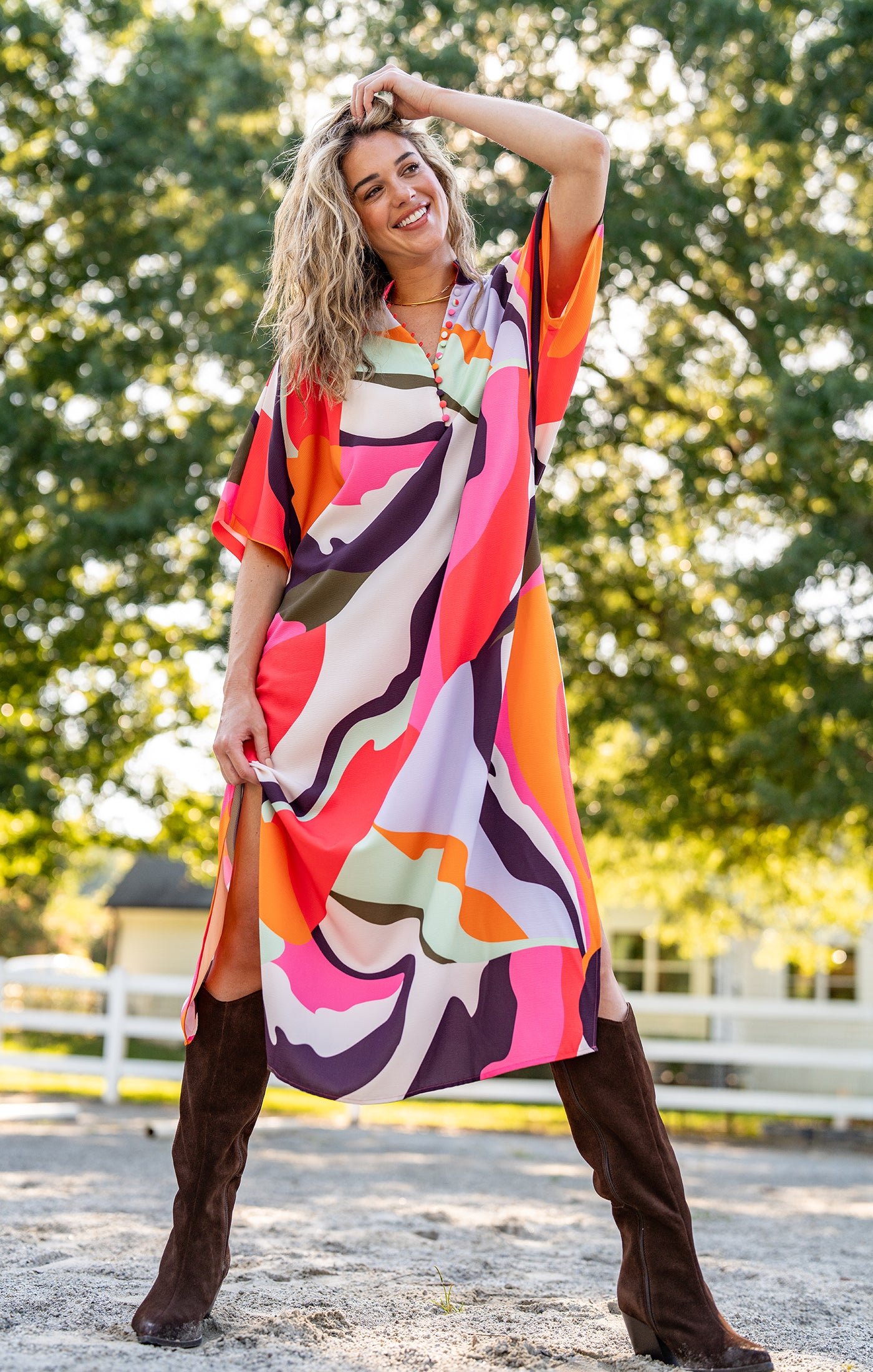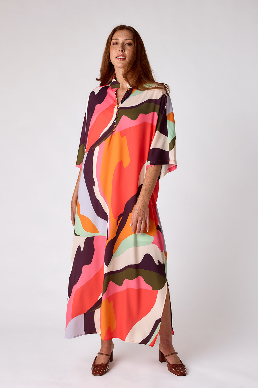 Meet the Audie Caftan - your new go-to for effortless drama. This slightly oversized caftan silhouette features a breezy dolman sleeve, flattering V-neckline with a high collar, and side slits for a little extra movement.