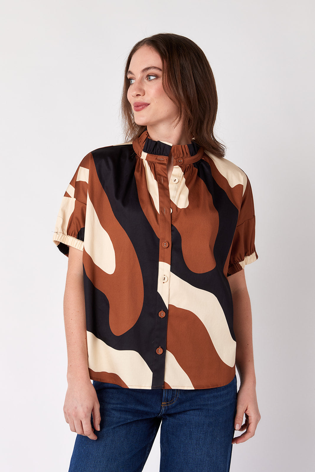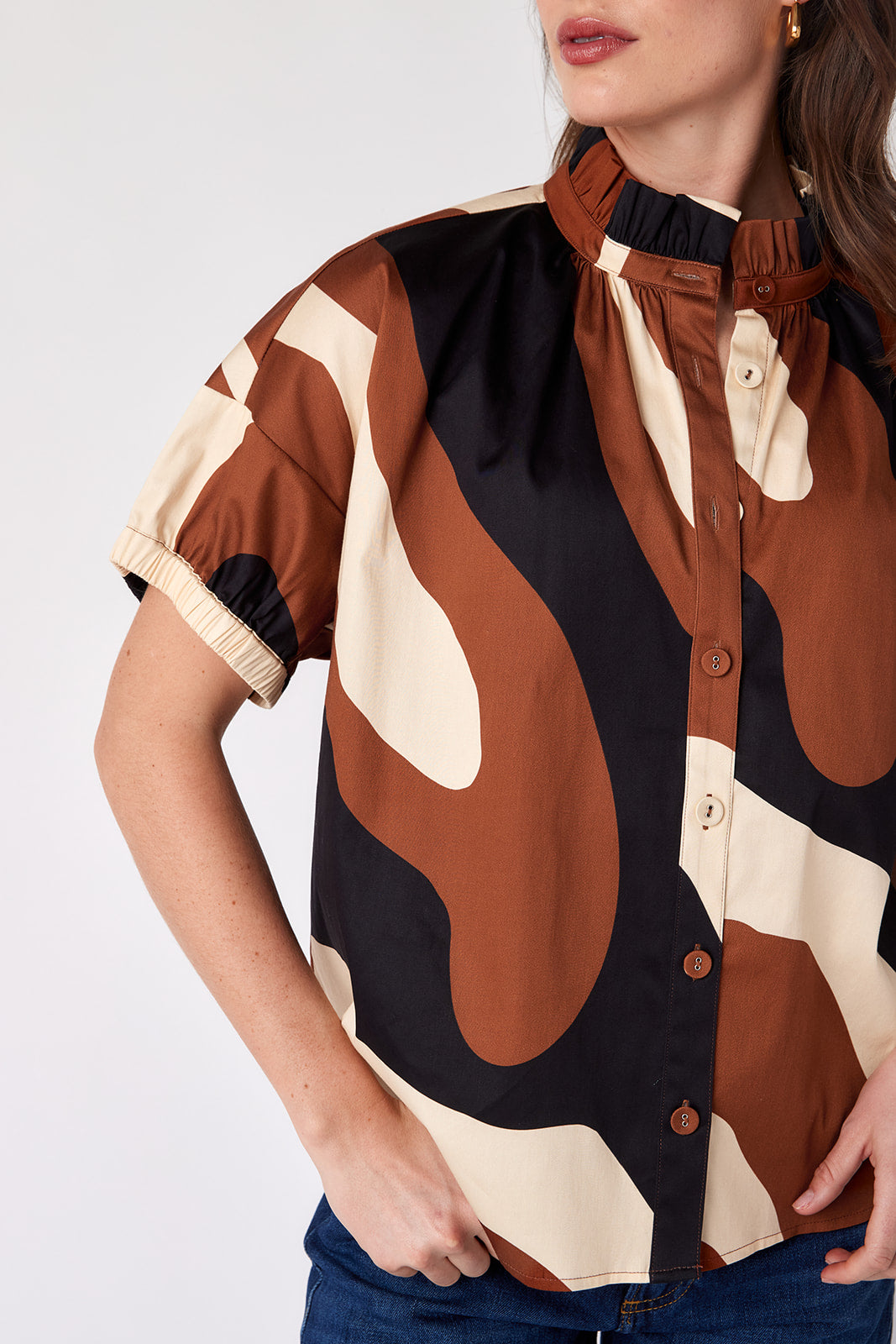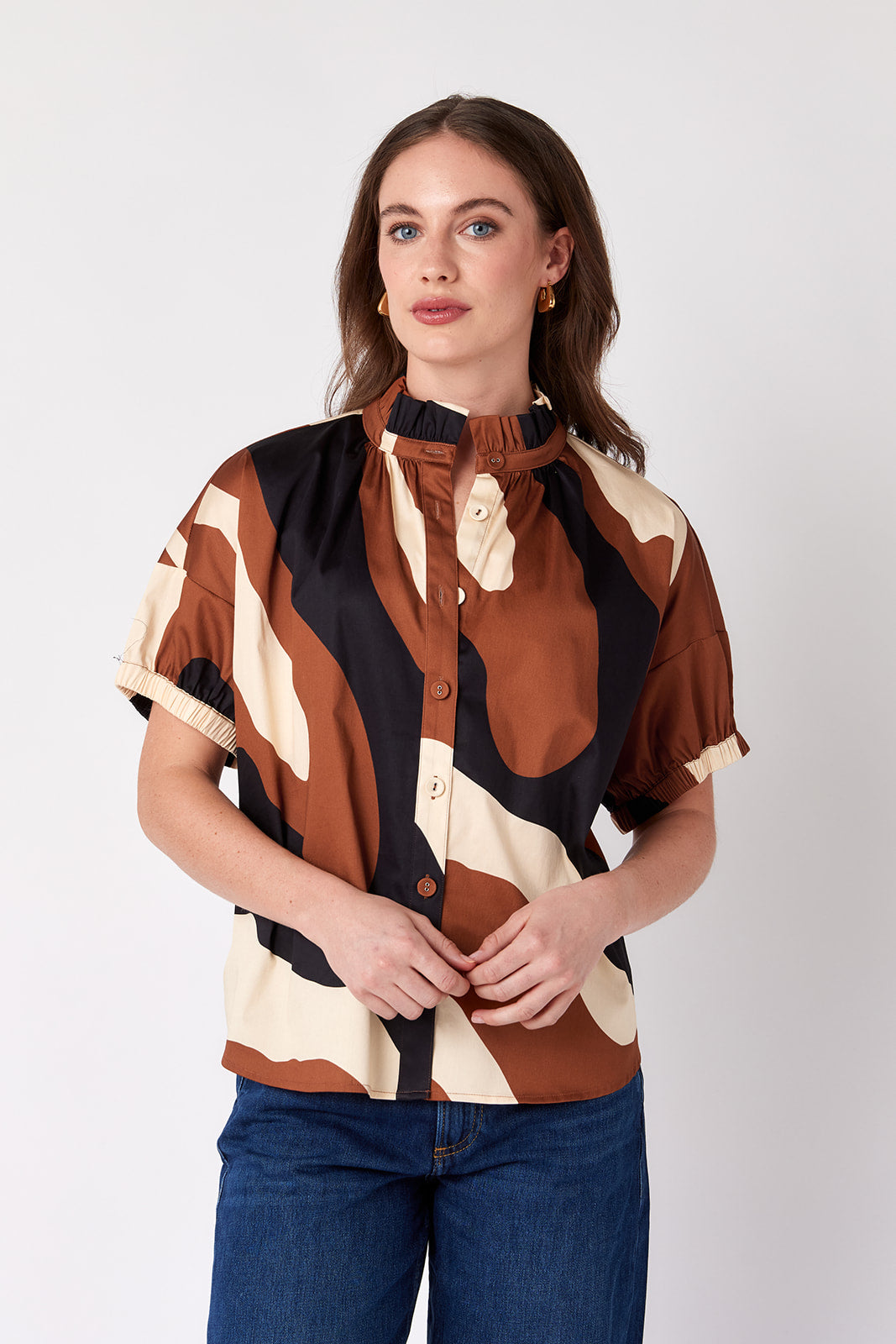 You’ll never struggle with what to wear when you add the Britt Top to your closet. She has a relaxed fit and features short puff sleeves with an elastic cuff. The ruffled collar adds a feminine touch to any outfit!