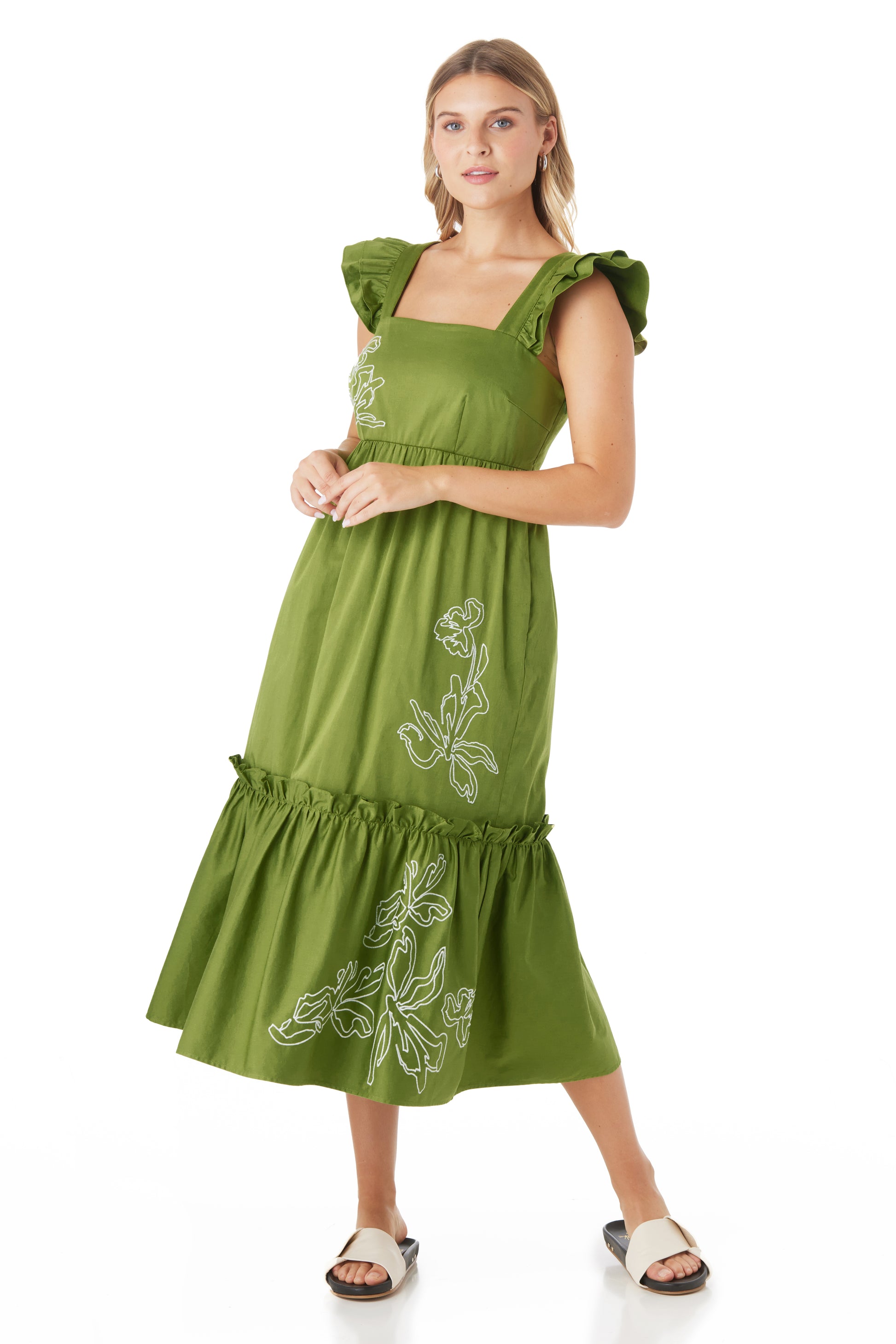 Elevate your springtime look with the Bryce Dress. We love the chic details including straps adorned with a double-ruffle at the shoulder and a straight neckline featuring smocking at the back bodice for a comfortable and secure fit. The tiered, gathered skirt features charming ruffle details, complemented by a side seam zip closure and convenient pockets.