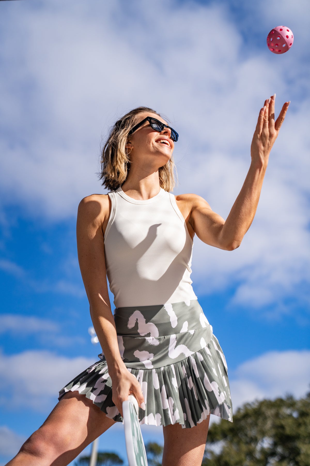 The Court Skirt is sporty AND chic! This A-line active skirt features built-in shorts with pockets plus sticky tape at leg opening to keep them securely in place and an asymmetrical pleated skirt.