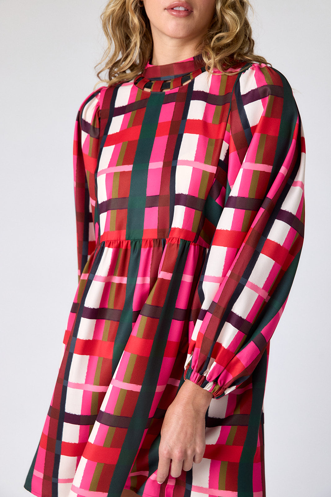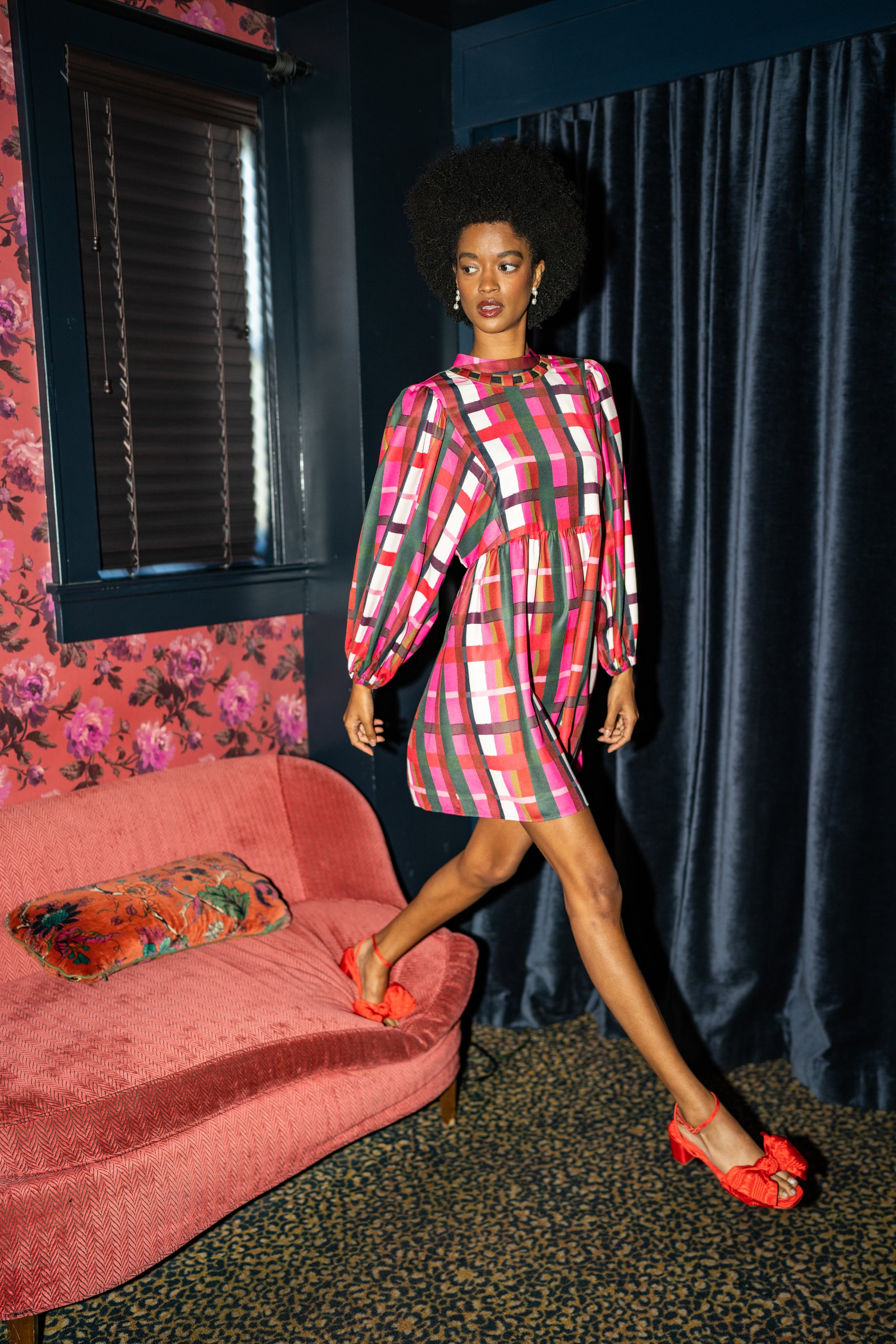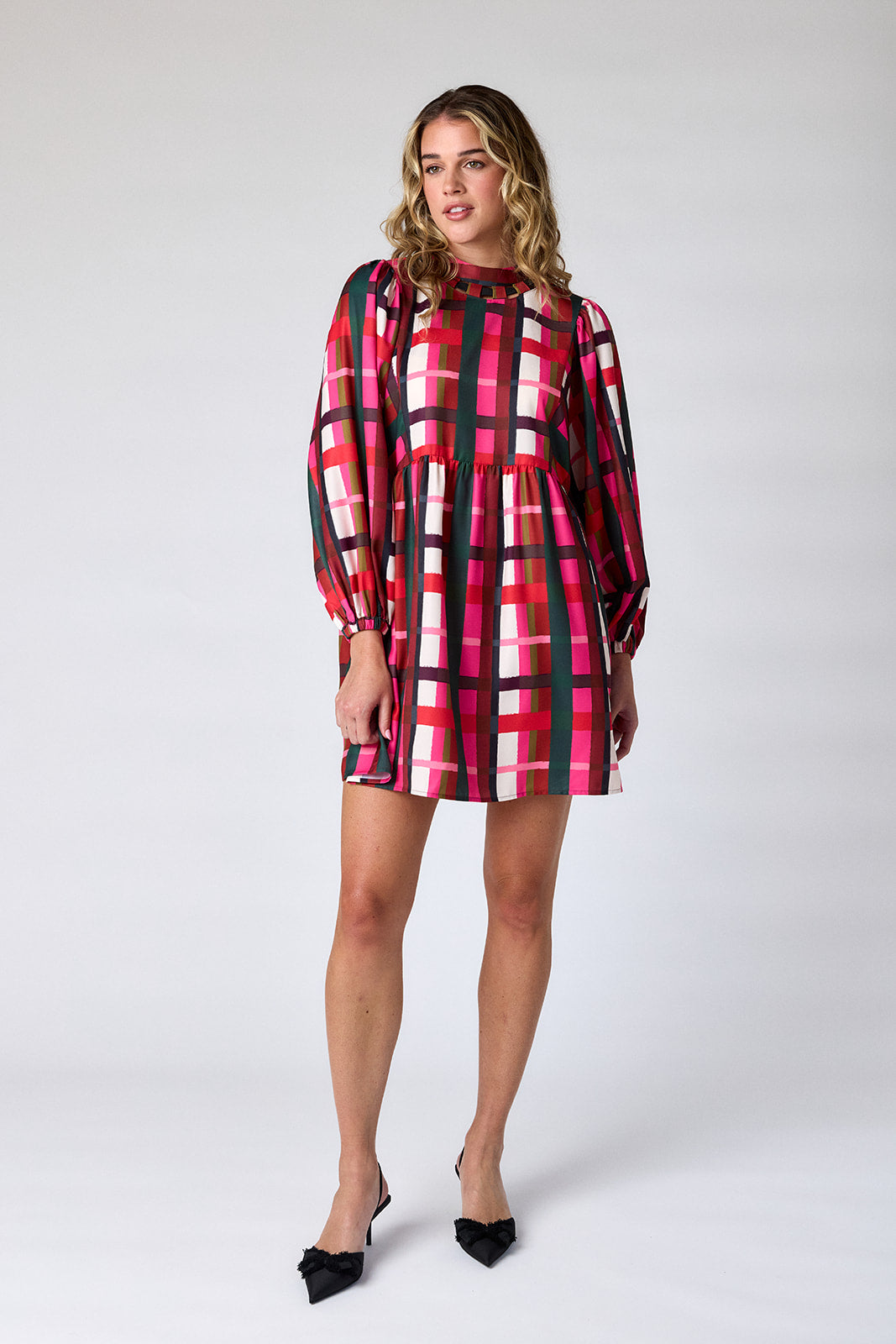 Fun and flirty, this dress is designed to turn heads. With its chic mock-neck collar, voluminous balloon sleeves, and flattering neckline details, it’s a must-have style for any occasion.
