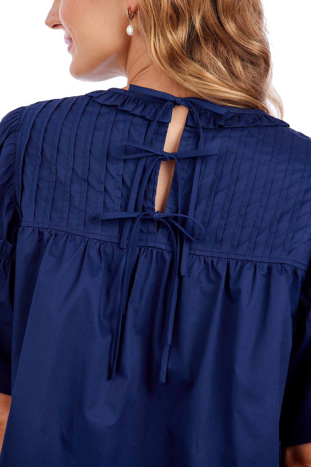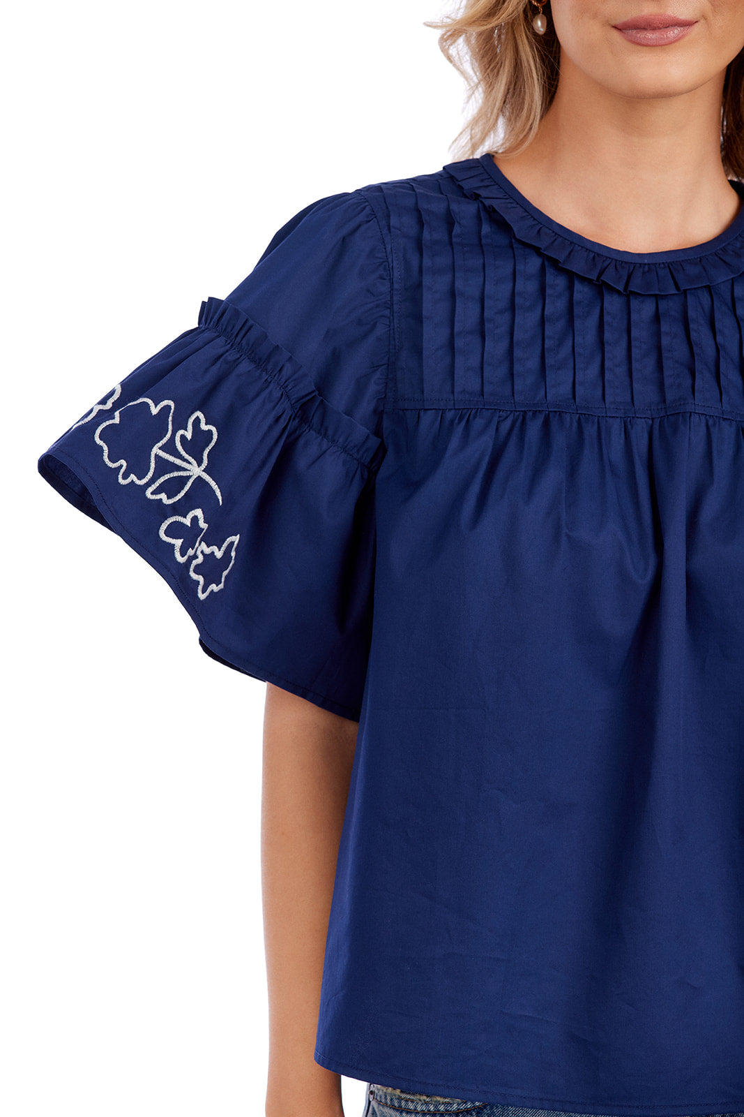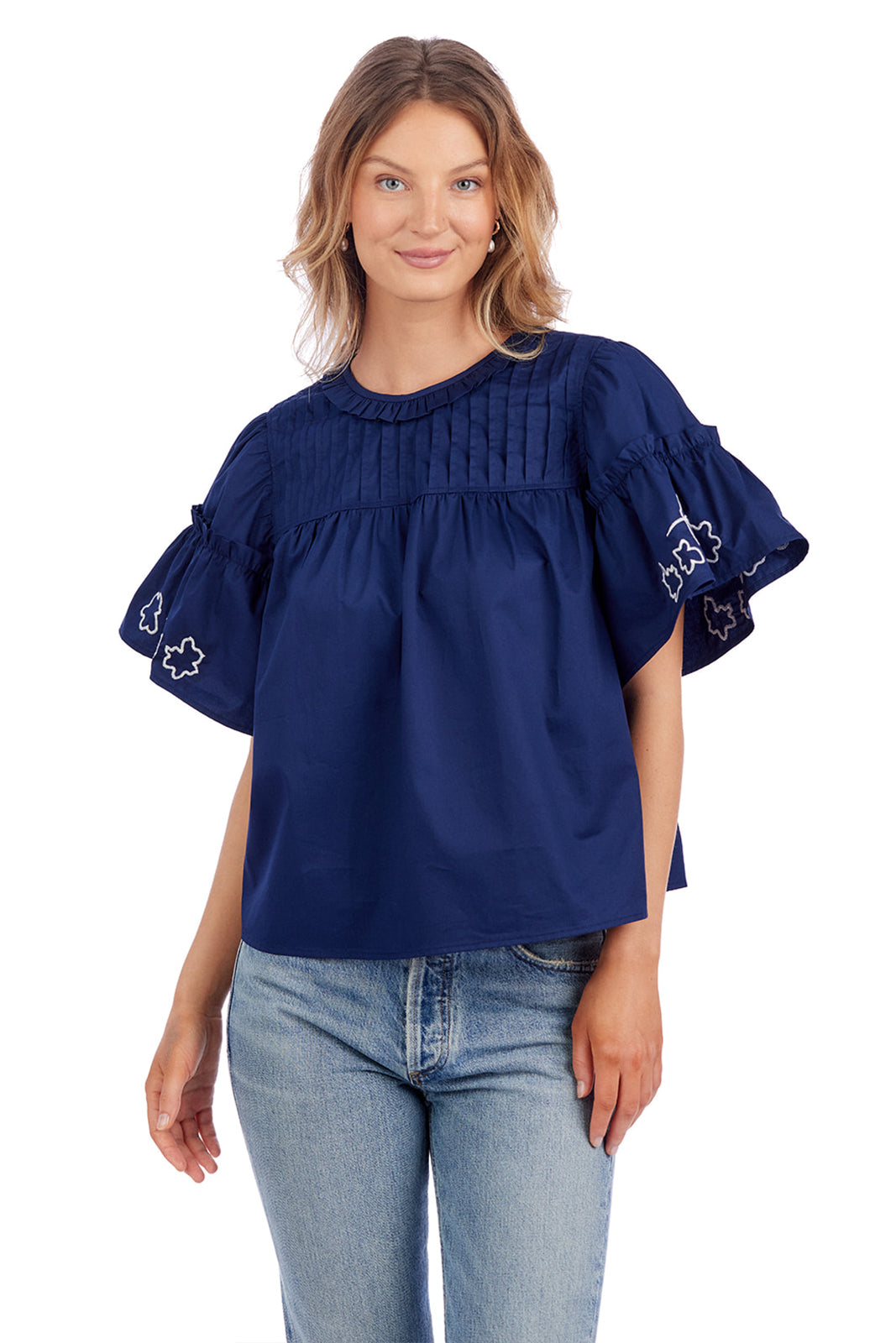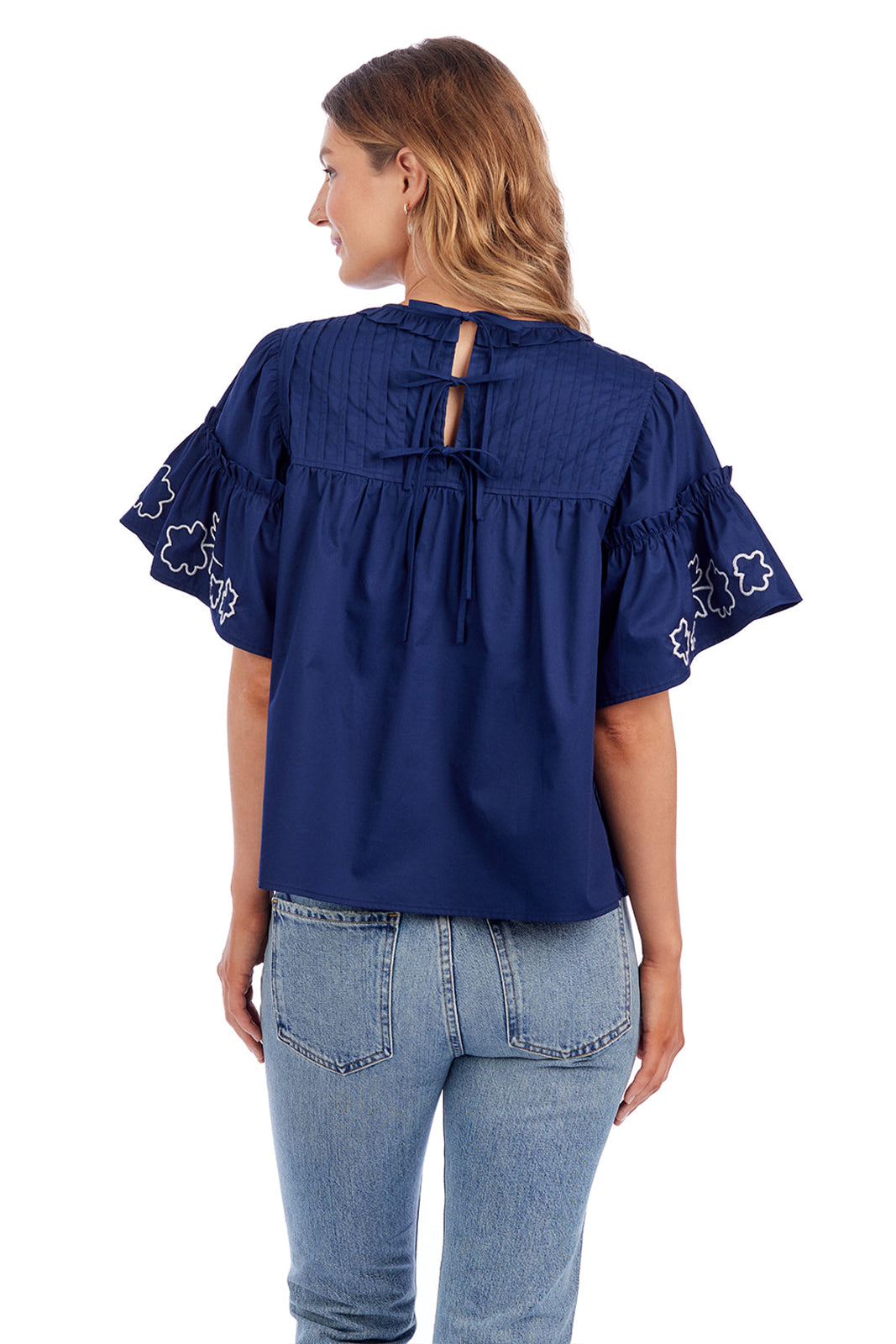 We absolutely adore all the feminine details that make this top perfect: pintuck yoke, flutter sleeves, gathered ruffles, hand-drawn embroidery, and tie back opening.