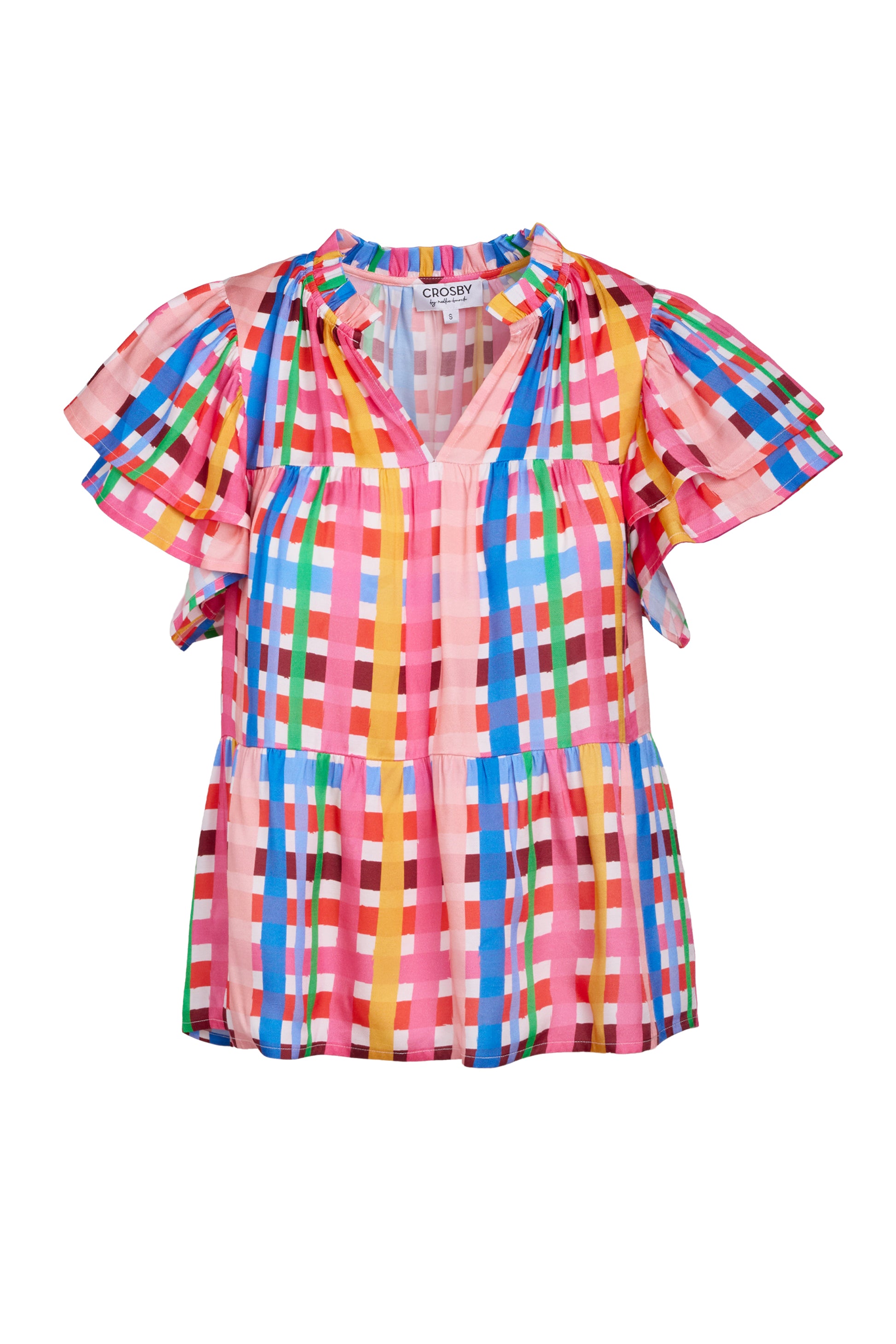 Your closet will thank you for adding Elodie to the mix. This airy, tiered top features a dropped-shoulder flutter sleeve and split neckline adorned with a playful ruffle trim.