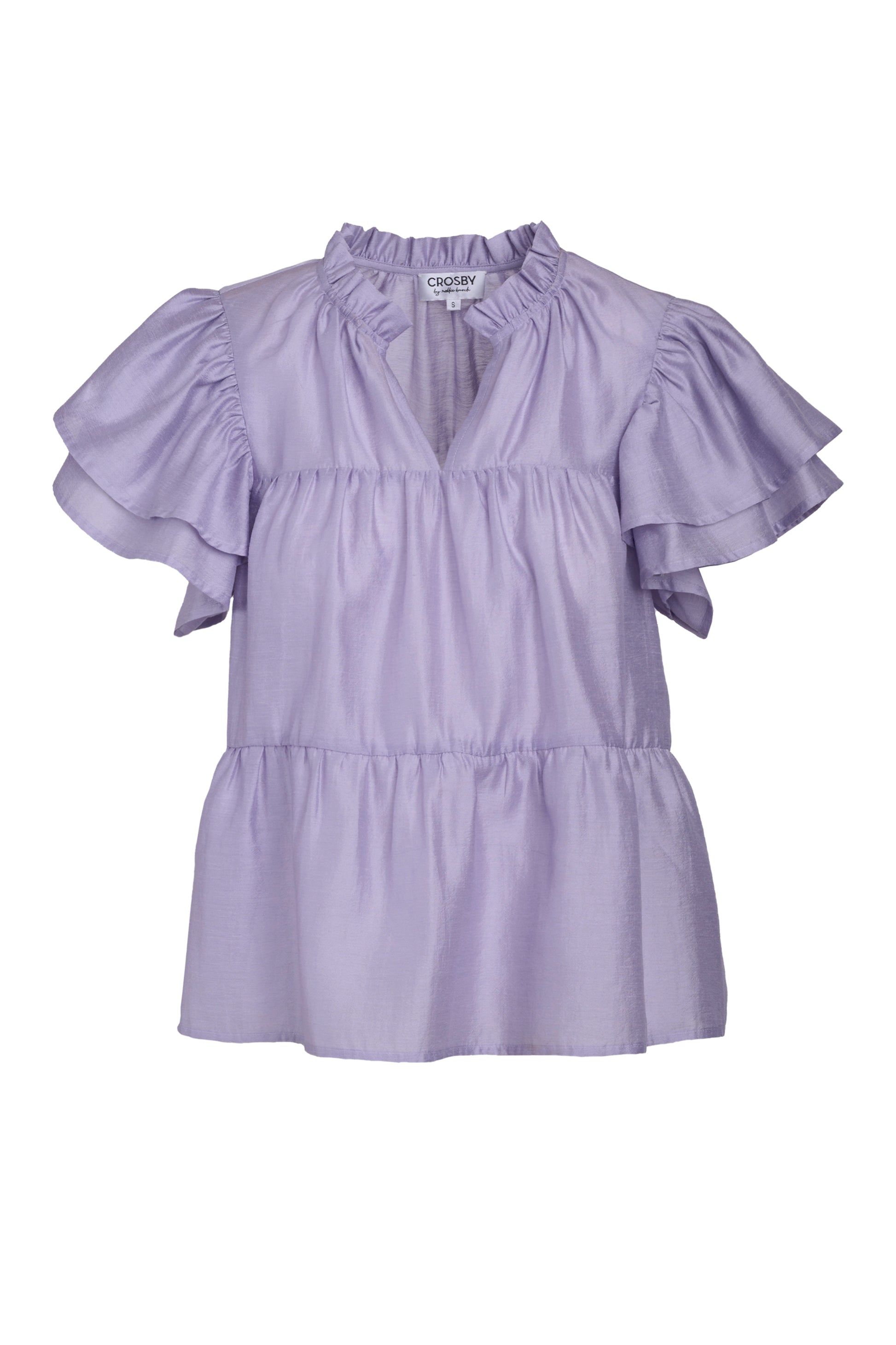 Your closet will thank you for adding Elodie to the mix. This airy, tiered top features a dropped-shoulder flutter sleeve and split neckline adorned with a playful ruffle trim.