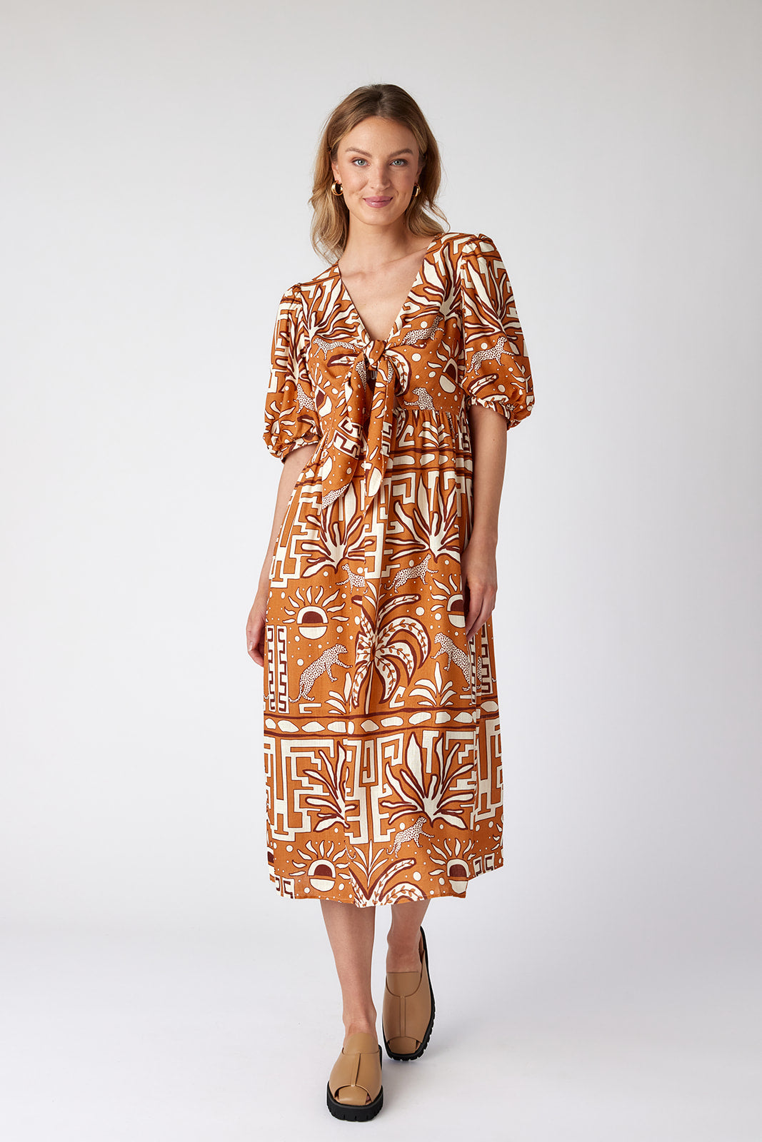 A classic A-line midi with a little twist (literally) across the chest. We can’t get enough of this sassy silhouette! Includes invisible side zipper on the left side. Pro-tip! Tie the front knot around the center of your bra to make the dress bra-friendly and feel extra secure.