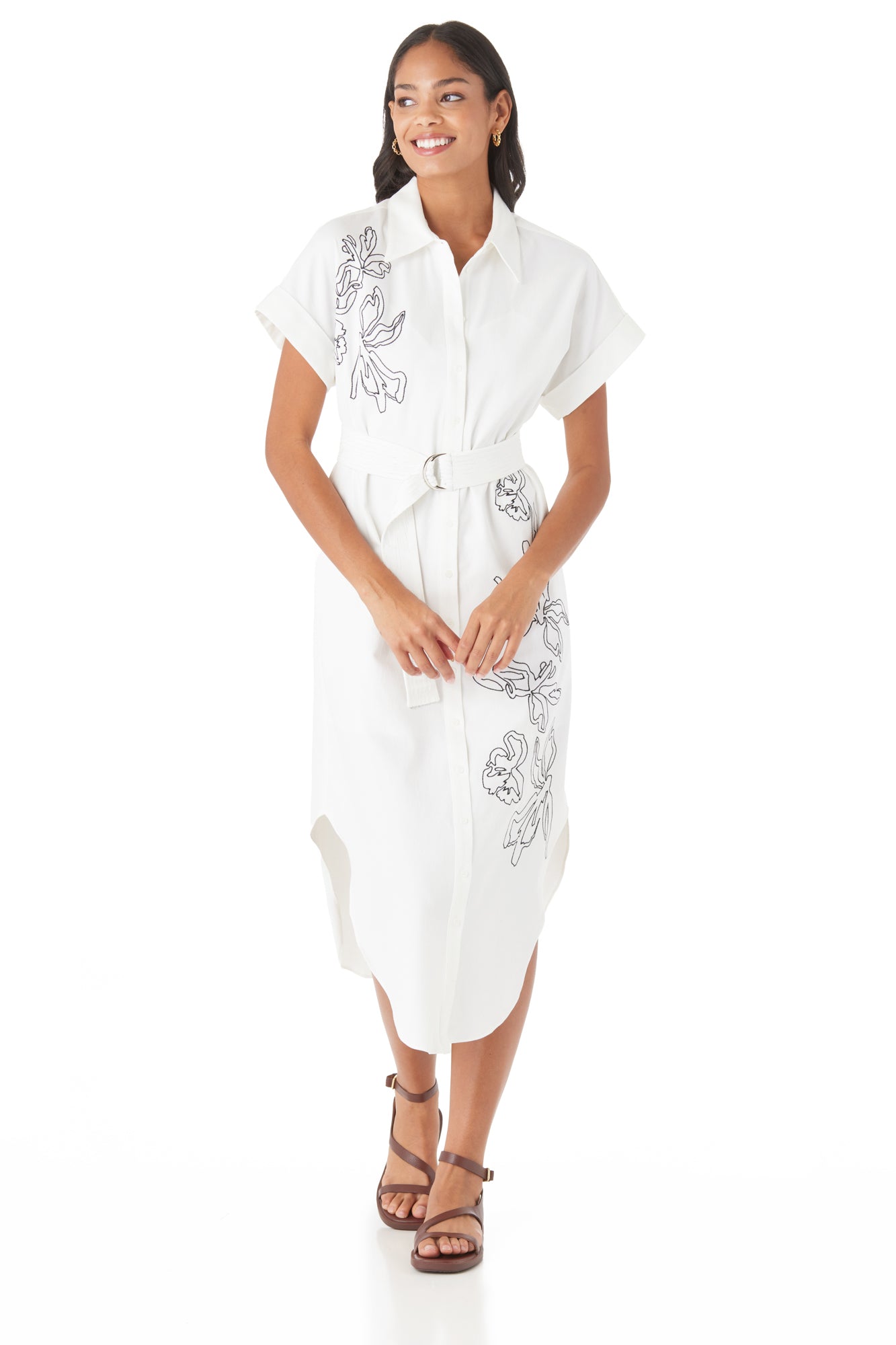 The Hannah Dress is back! We love this button-down collared shirt dress featuring a dramatized shirttail hem and pleats at the back for added detail. How fun is the hand-drawn embroidery? Includes removable double D-ring belt and pockets, of course!