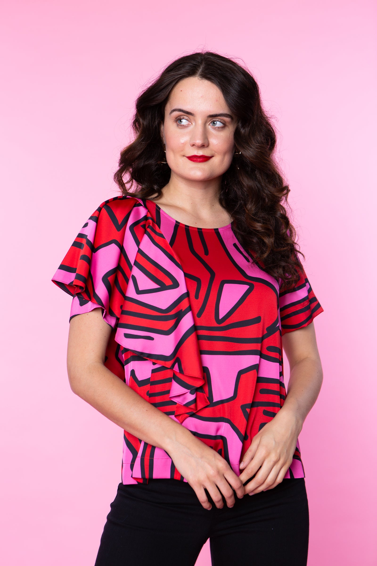 The Harper Top is a true statement piece. From the bold Labyrinth print to the soft Rose Quartz, to the classic Ruby, you’ll be sure to stand out wherever you go! With the comfort of a tee and the style of a snazzy blouse, this top makes an easy addition to your wardrobe.