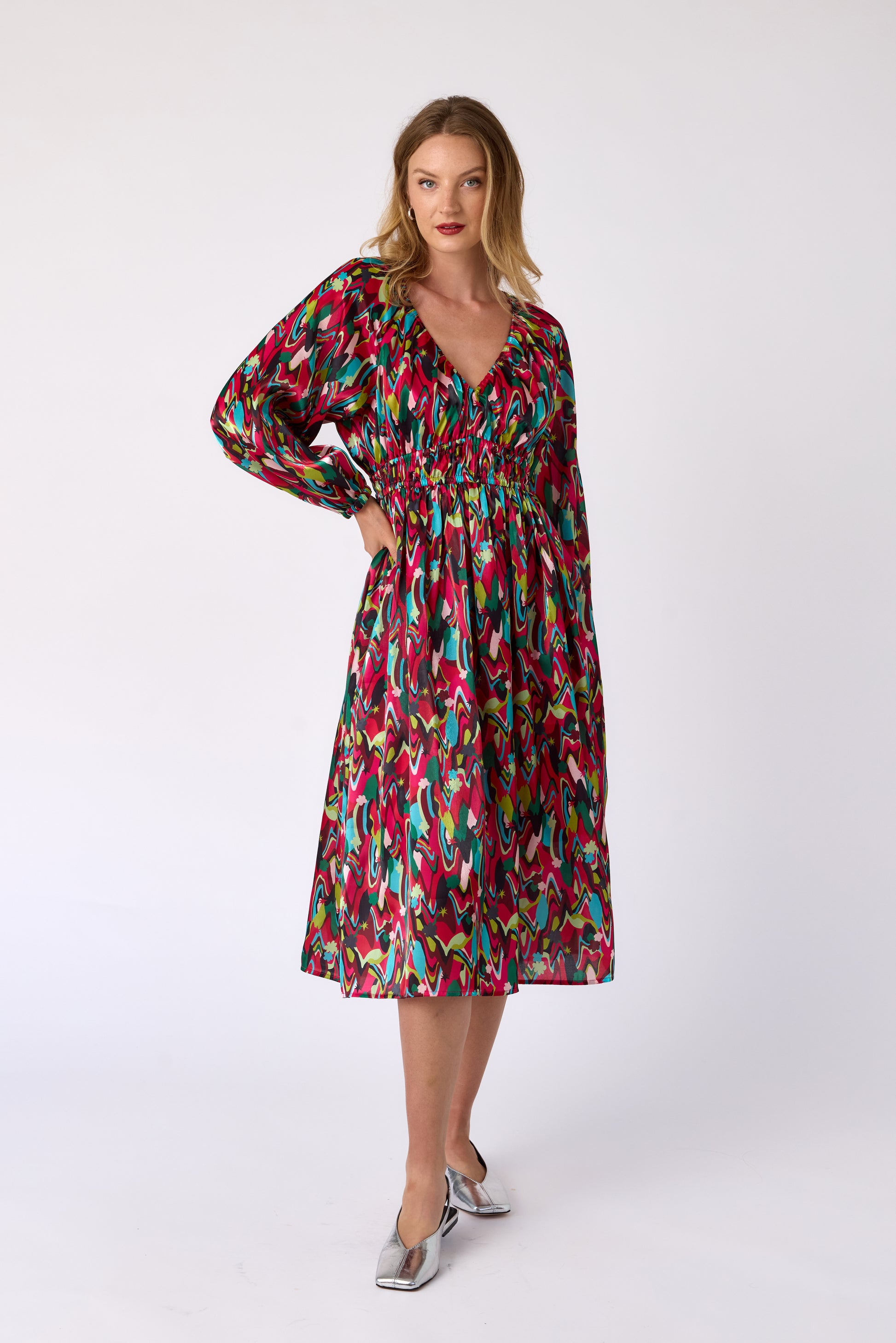 - Midi length dress with a fitted elasticized bodice and a full skirt