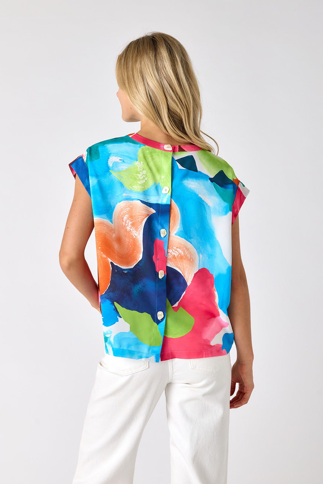 Our best-selling Leo Top is back! This straight-fit top features a button-back closure, cuff details at the armhole opening, and a crew neckline. Plus, it's bra-friendly!