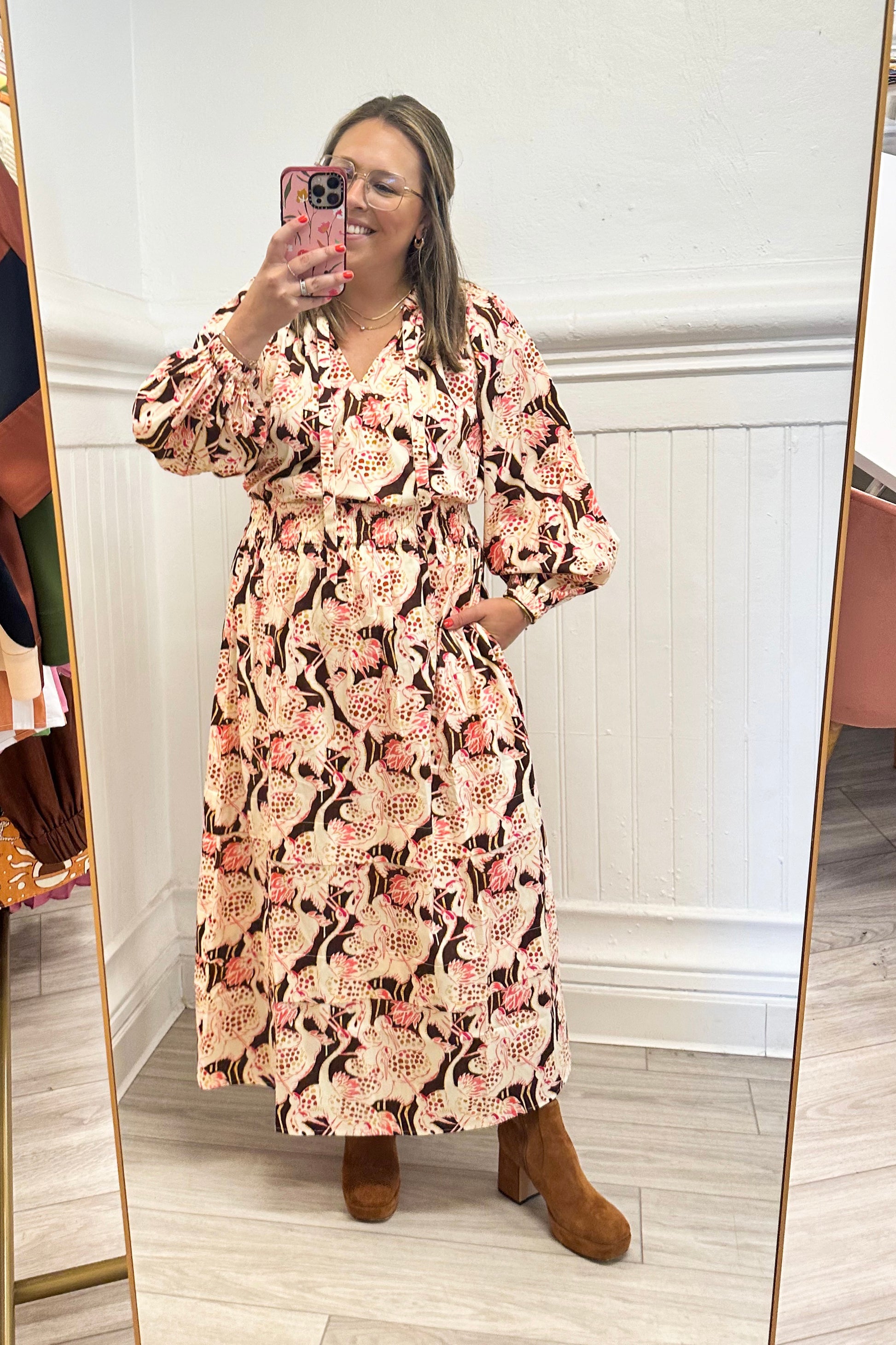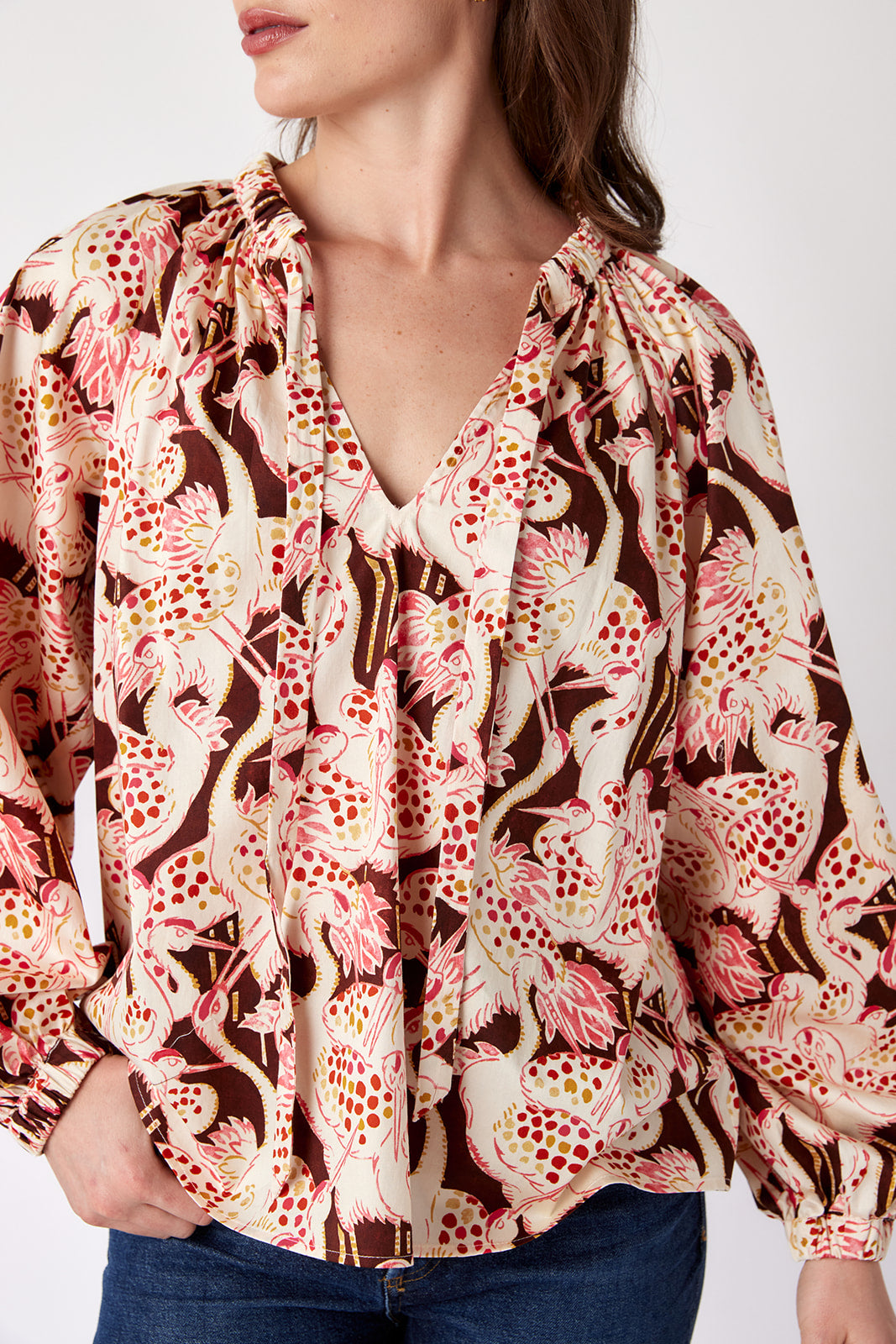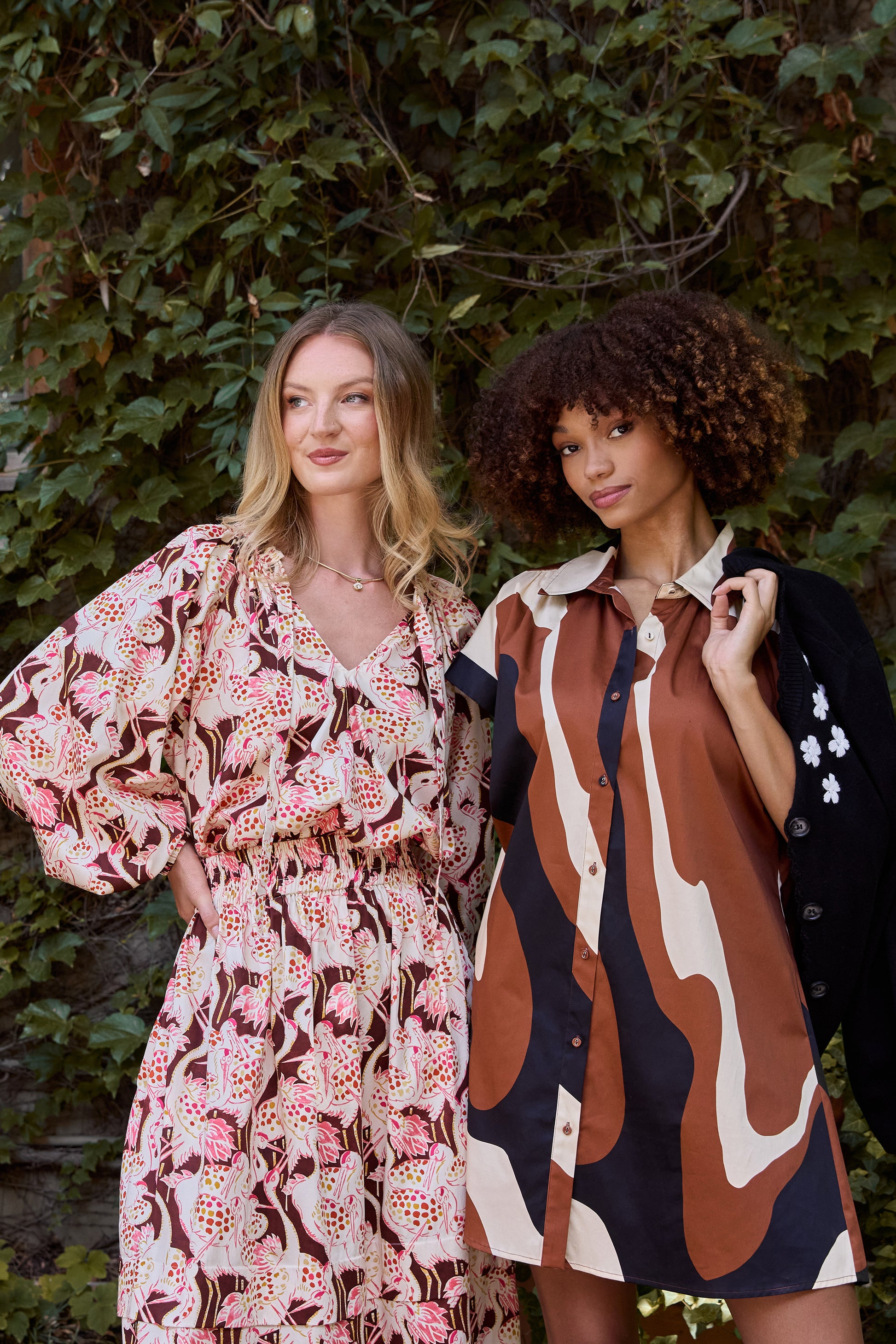 Our best-selling Monroe Top returns in fresh fall prints. This top features a flowy silhouette, V-neckline, full-length balloon sleeves, and an elastic neckline with functional drawcord ties.