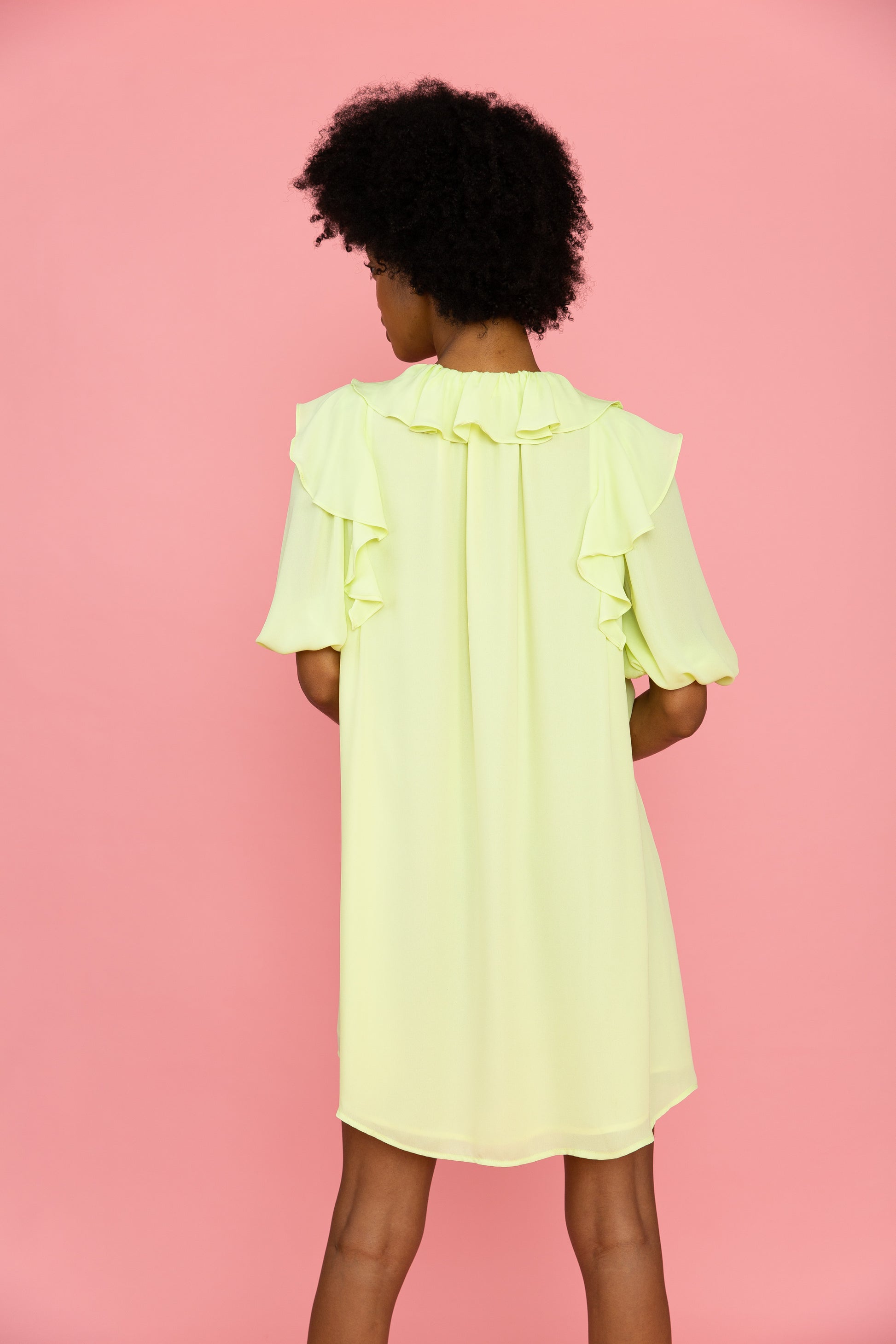 The Presley Dress might just be the sweetest dress this season! Featuring a flattering A-line silhouette with ruffled v-neckline and elasticized sleeve cuffs.