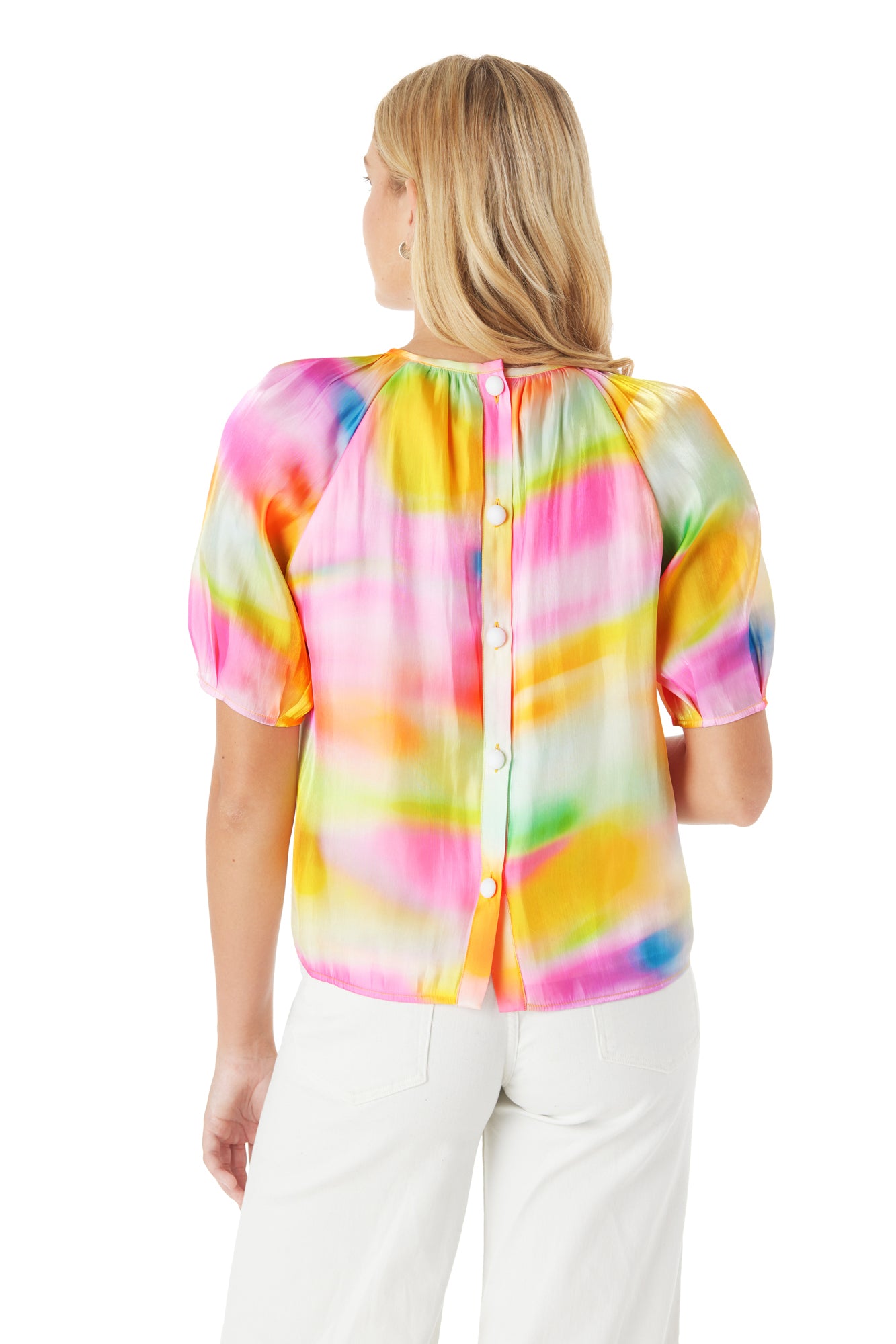 We can’t get enough of the Raelynn Top. This relaxed-fit top features a crew neckline, raglan puff sleeves, and fun back button details.