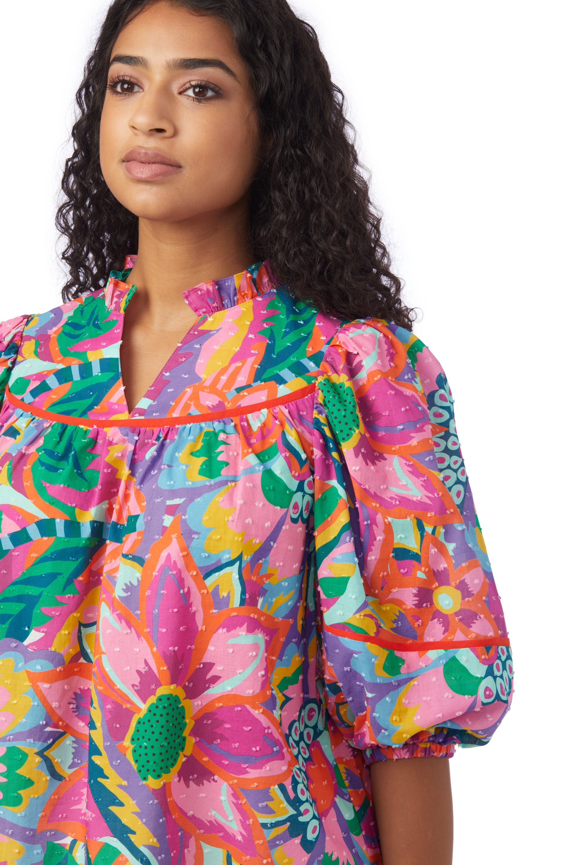 Janet Adorable top! Got the XS and it fits perfect. The colors are just beautiful, bright pinks and purple and greens. Very light material so perfect for summer weather. Wore it recently on a 90+ degree day and stayed comfortable.