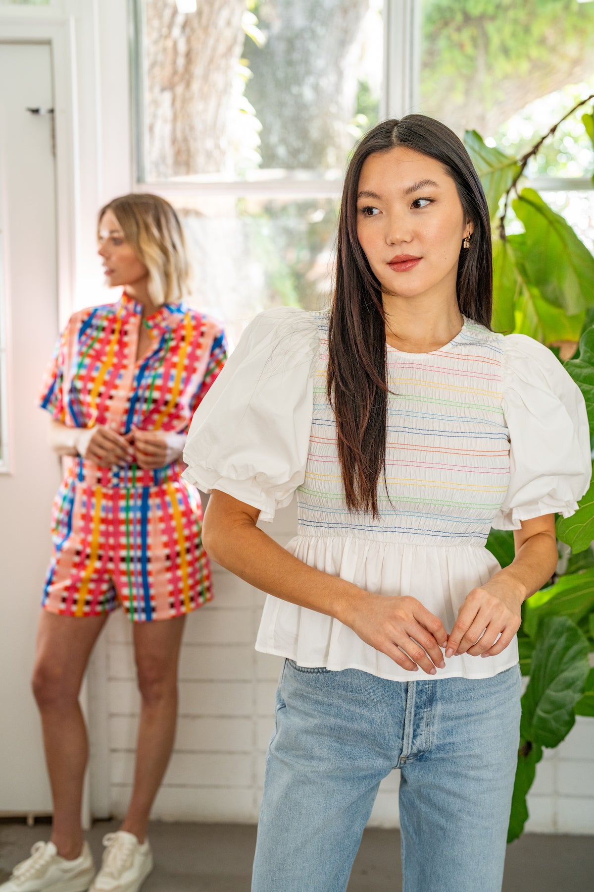 Ready to show off your waist and have a little fun? The Sloan Top is sure to turn heads this spring. We love the playful twist of the rainbow detailing in the smocking, a fun CROSBY take on a solid!