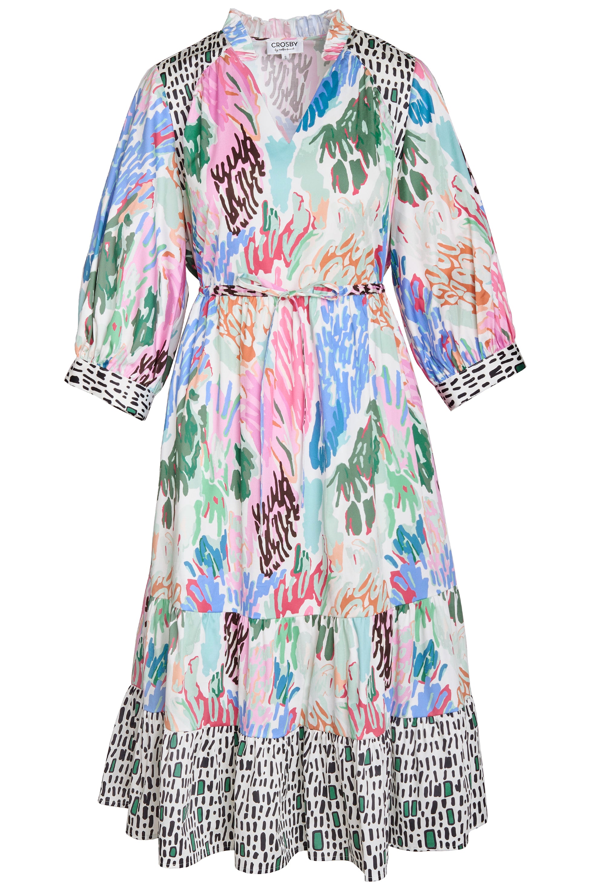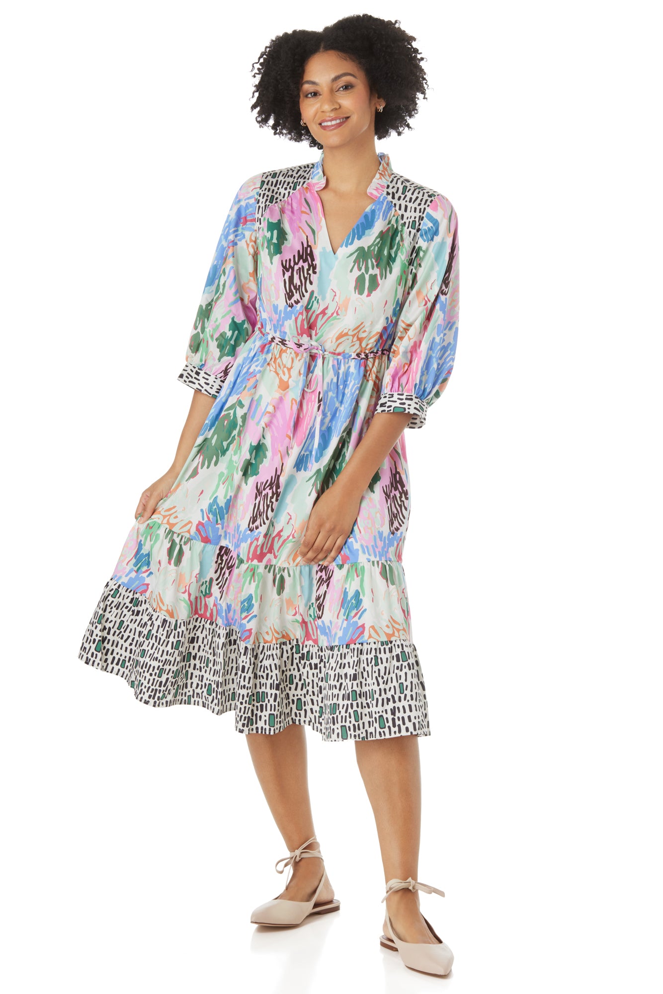 Elevate your spring wardrobe with the effortlessly chic Tallie Dress. This midi features a v-neckline with delicate ruffle collar, ¾-length balloon sleeves, and of course, pockets! Embrace a flattering silhouette with the functional drawcord at the waist.