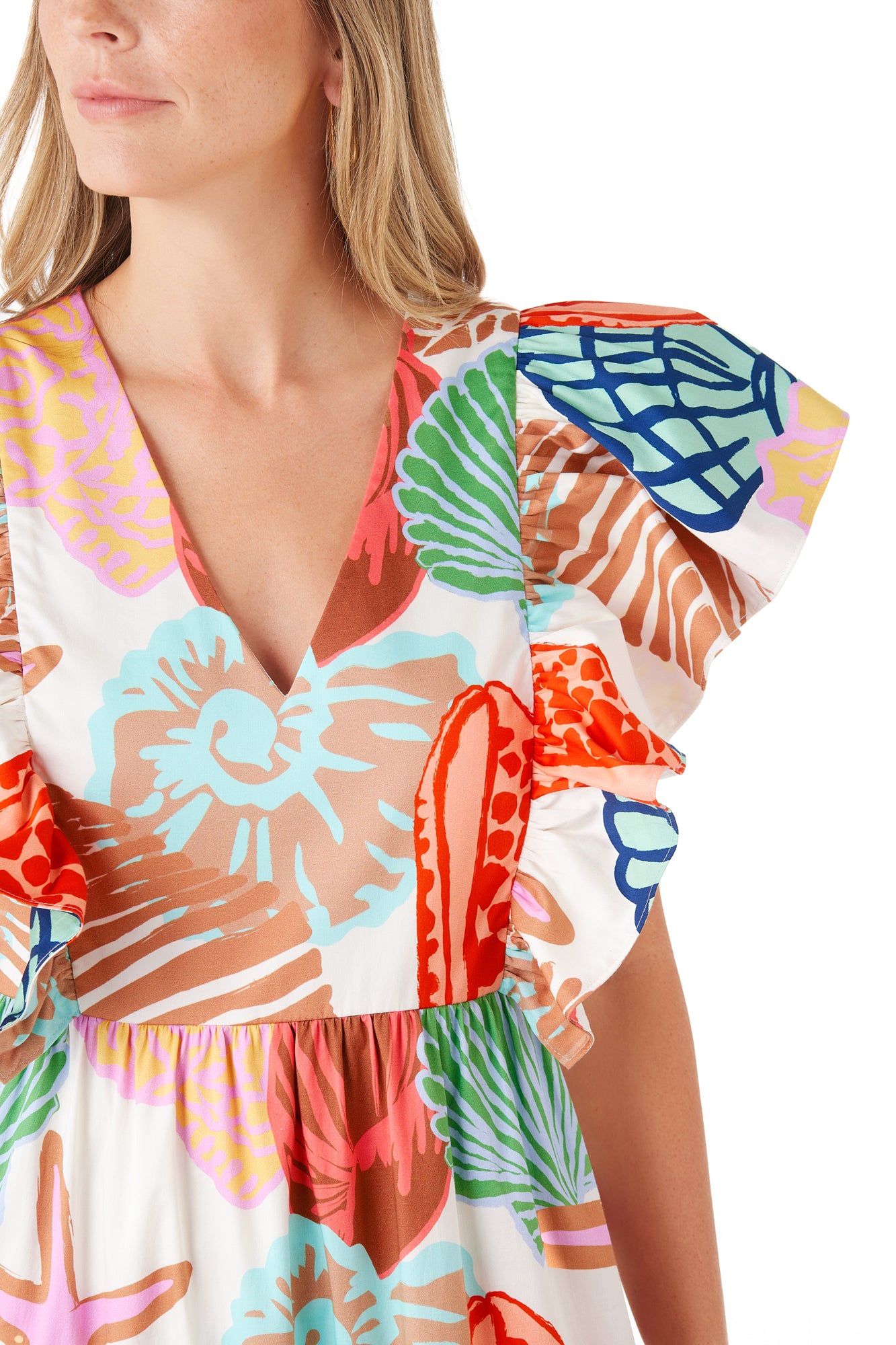 The Walker Dress is maxi length and features a flattering V-neckline, oversized flutter sleeves, and a tiered skirt with a double ruffle hem.