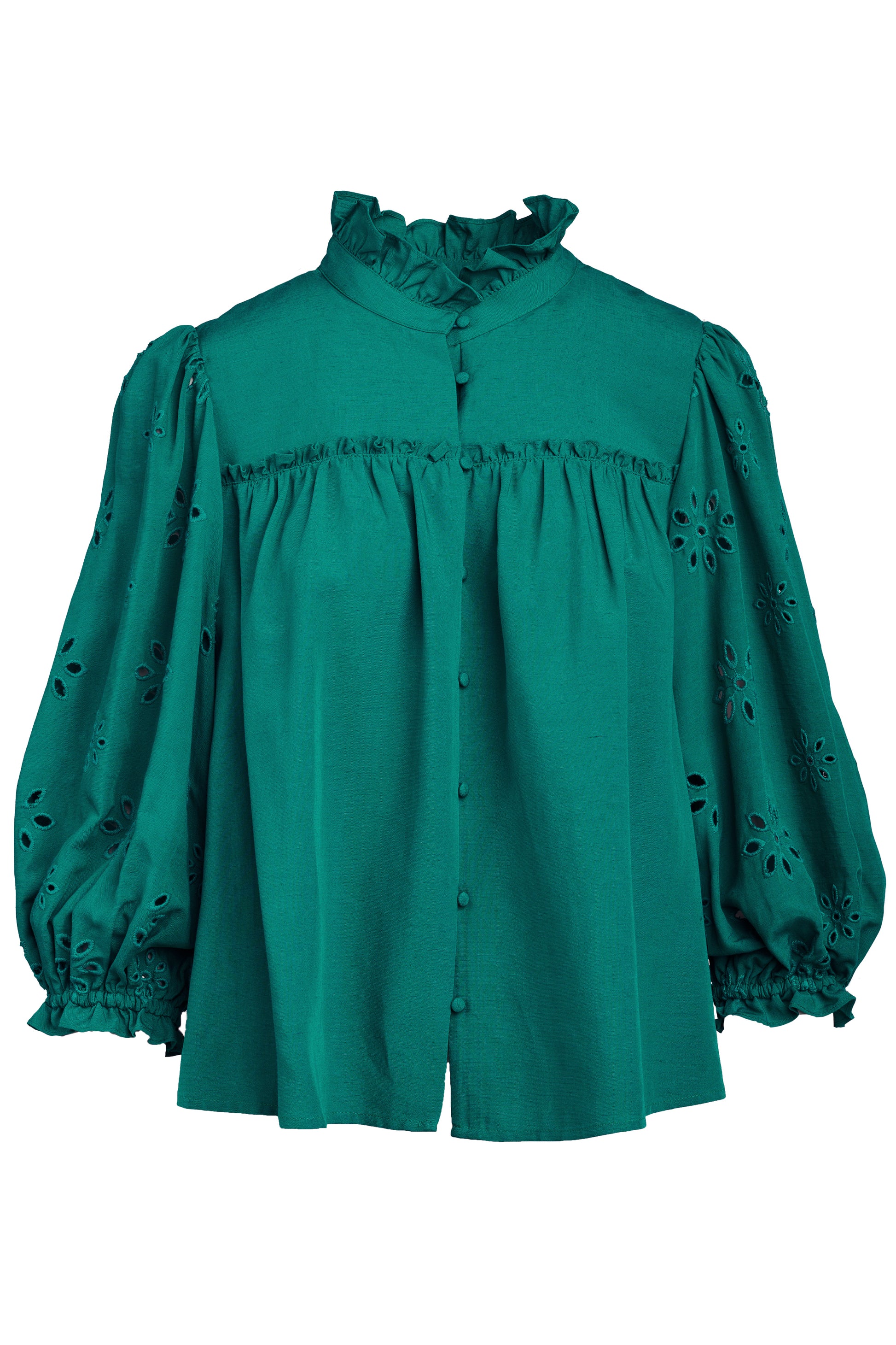 Our fan favorite blouse is back! With elements like self fabric covered buttons down the center, full length sleeves, and ruffle details at collar, yoke, and sleeve – she’s classy and charismatic.